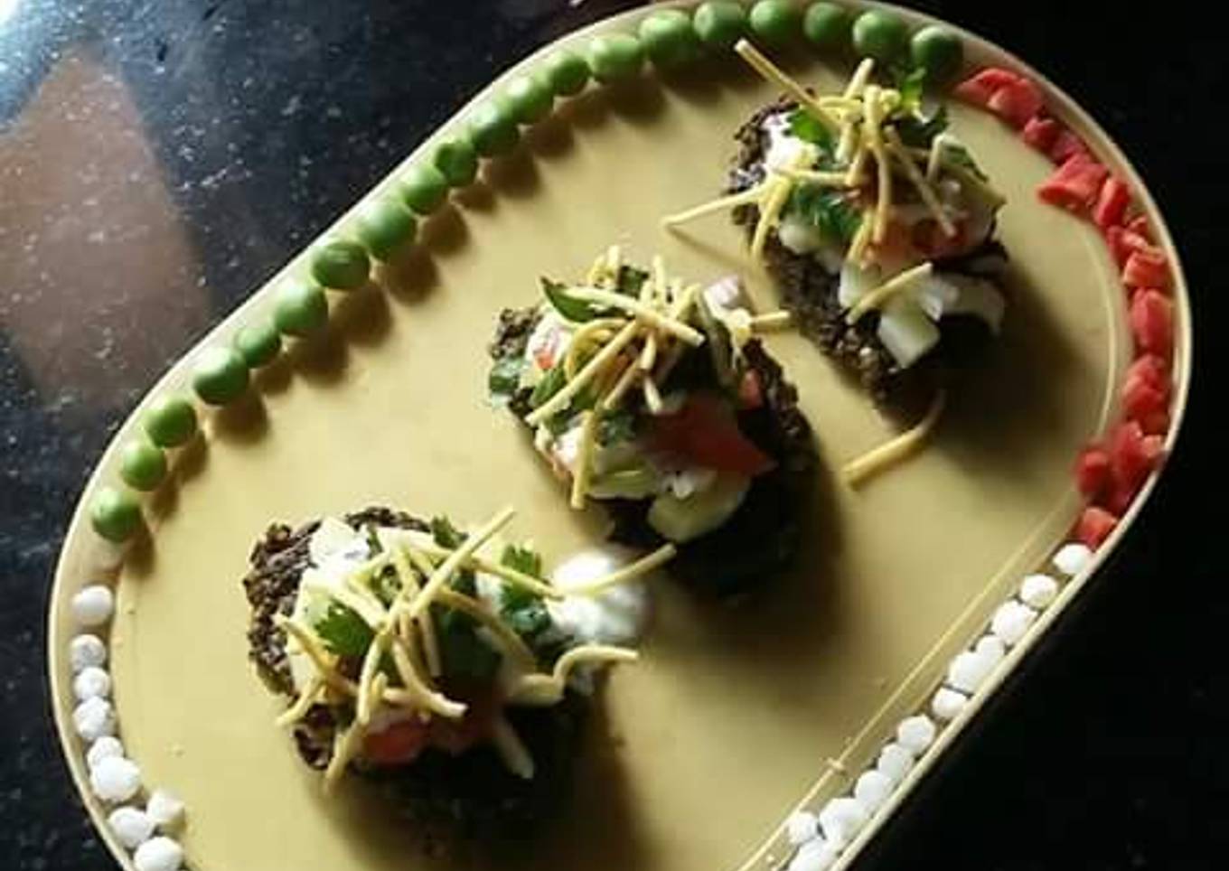 - Making chat :- place Kothimbir vadi in a plate put some chopped onion, chopped tomatoes, chopped potato, sweet curd, tamarind chutney, mint chutney, chat masala, coriander, sev