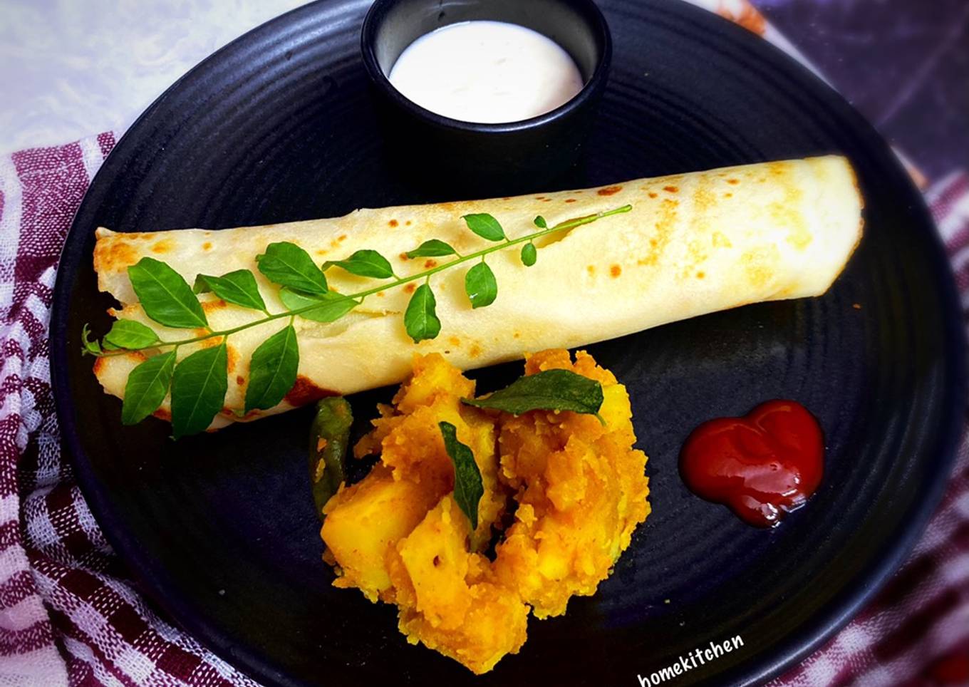 - Now place on a plate and put 2 tbsp of masala Aloo curry and roll over. Serve hot with tomato sauce and some aloo curry as well and curd. Enjoy your breakfast